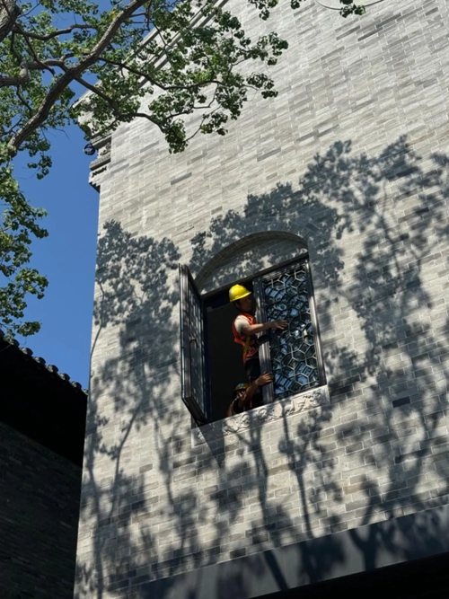 工人們正如同一支默契的交響樂團,精心地安裝著花窗,陽光透過樹枝的縫隙,投下斑駁的影子,倒映在上面。他們以一顆辛勤的心,塑造著每一處風(fēng)景。