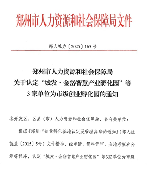 近日,鄭州市人力資源和社會保障局發(fā)布關于認定“城發(fā)·金岱智慧產業(yè)孵化園”等3家單位為市級創(chuàng)業(yè)孵化園的通知。根據《鄭州市創(chuàng)業(yè)孵化基地及管理辦法的通知》(鄭人社就業(yè)〔2015〕5號)文件精神,經申請、資料評審、實地考察和公示等程序,認定“城發(fā)·金岱智慧產業(yè)孵化園”等3家單位為市級創(chuàng)業(yè)孵化園,并頒發(fā)鄭州市創(chuàng)業(yè)孵化園榮譽牌匾。