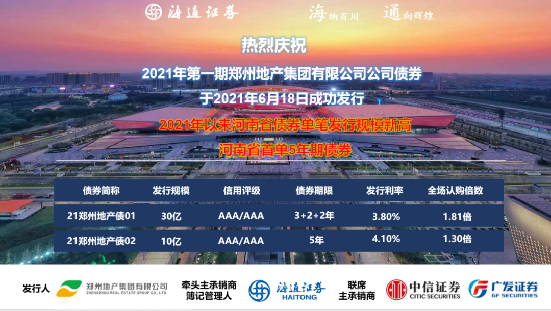 黨史學(xué)習(xí)教育在鄭州地產(chǎn)集團如火如荼開展,集團黨委在鄭州市委、市政府的領(lǐng)導(dǎo)下,在鄭州市國資委黨委的監(jiān)管下,在學(xué)黨史、悟初心的基礎(chǔ)上,將“辦實事、解難題”作為黨史學(xué)習(xí)教育的重要內(nèi)容,充分釋放黨建紅色生產(chǎn)力,推進黨史教育深入業(yè)務(wù)實踐,引領(lǐng)業(yè)務(wù)高質(zhì)量發(fā)展。在集團黨委的堅強領(lǐng)導(dǎo)下,鄭州地產(chǎn)集團6月18日成功發(fā)行第一期優(yōu)質(zhì)企業(yè)債券40億元,3+2+2年期產(chǎn)品發(fā)行利率3.8%,5年期產(chǎn)品發(fā)行利率4.1%。本次發(fā)行創(chuàng)河南省首單5年期企業(yè)債券,創(chuàng)2021年以來河南省債券單筆發(fā)行規(guī)模新高,是鄭州地產(chǎn)集團資本市場融資工具的又一創(chuàng)新探索!